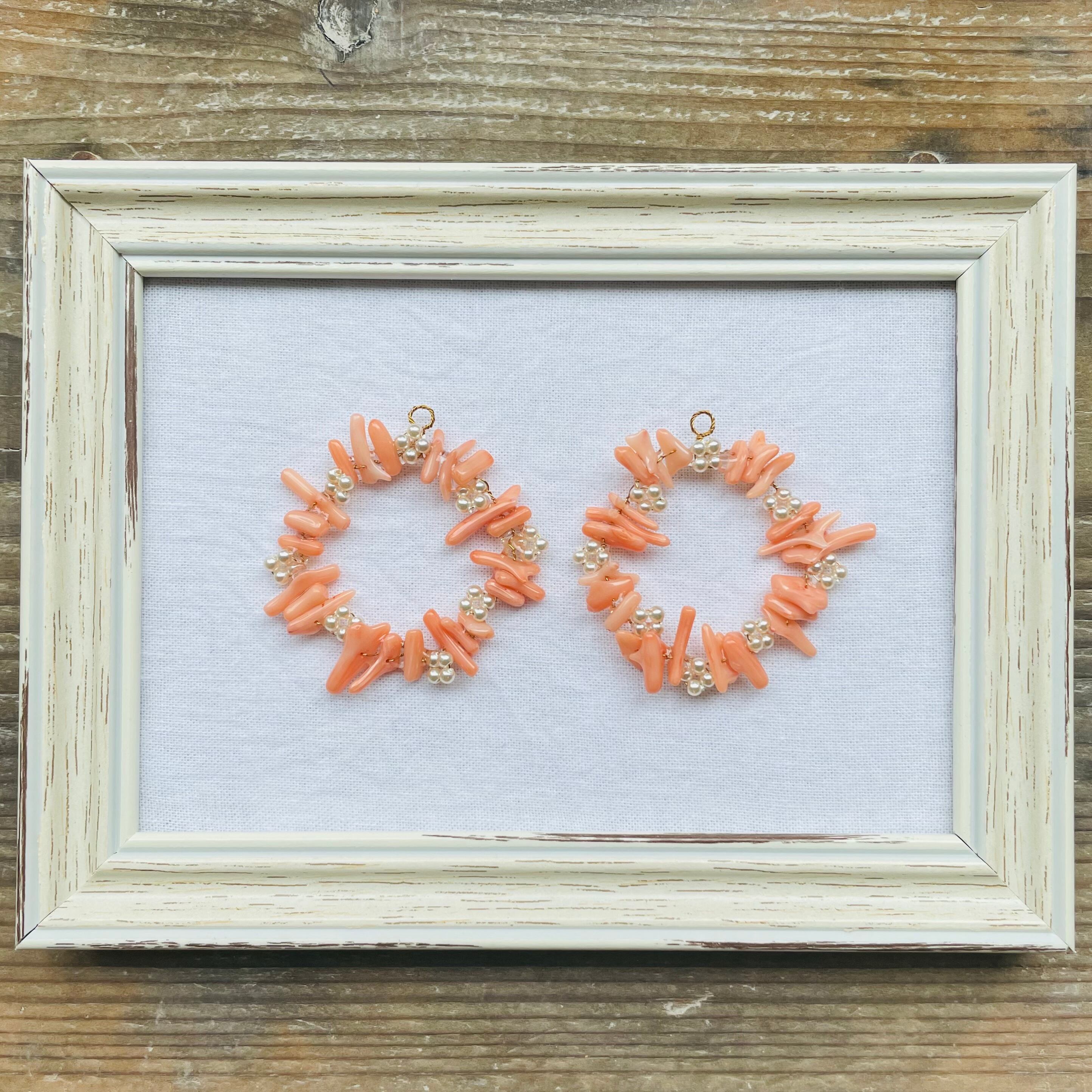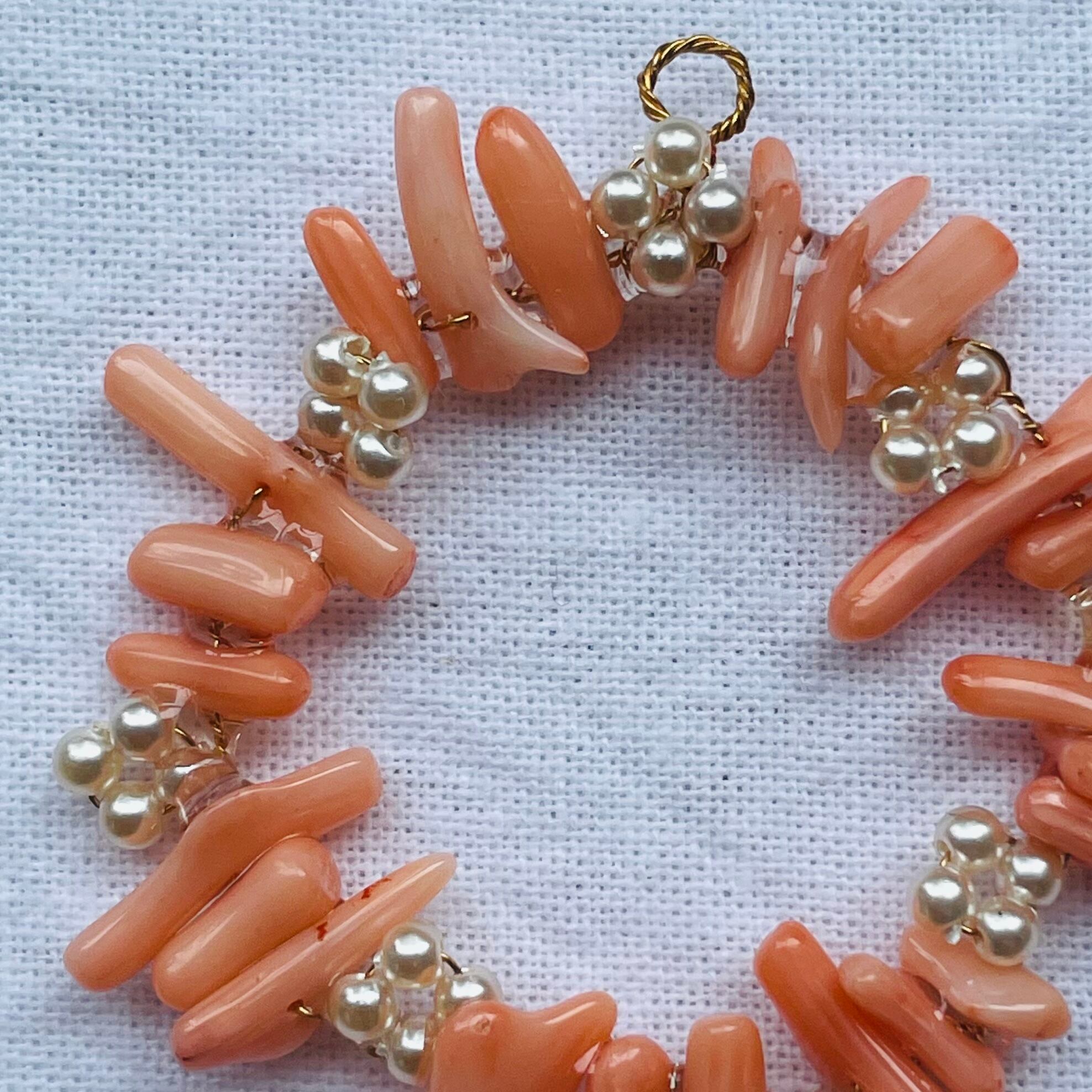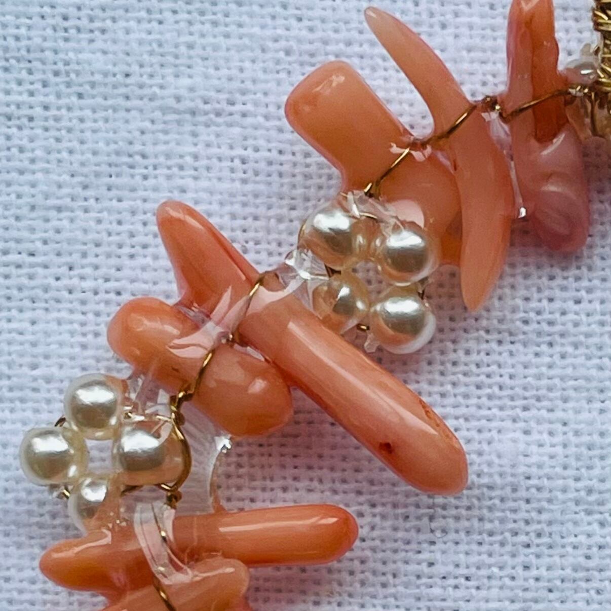 天然の小さな珊瑚を真鍮のワイヤーとガラスビーズで花を編みながらつなげました。