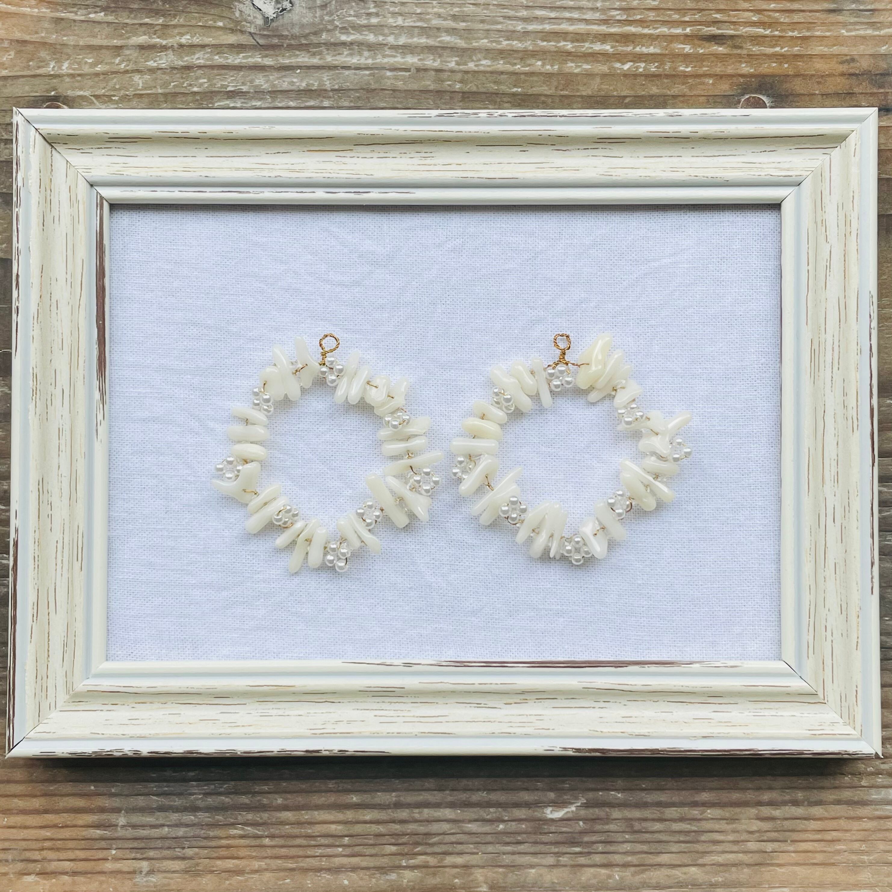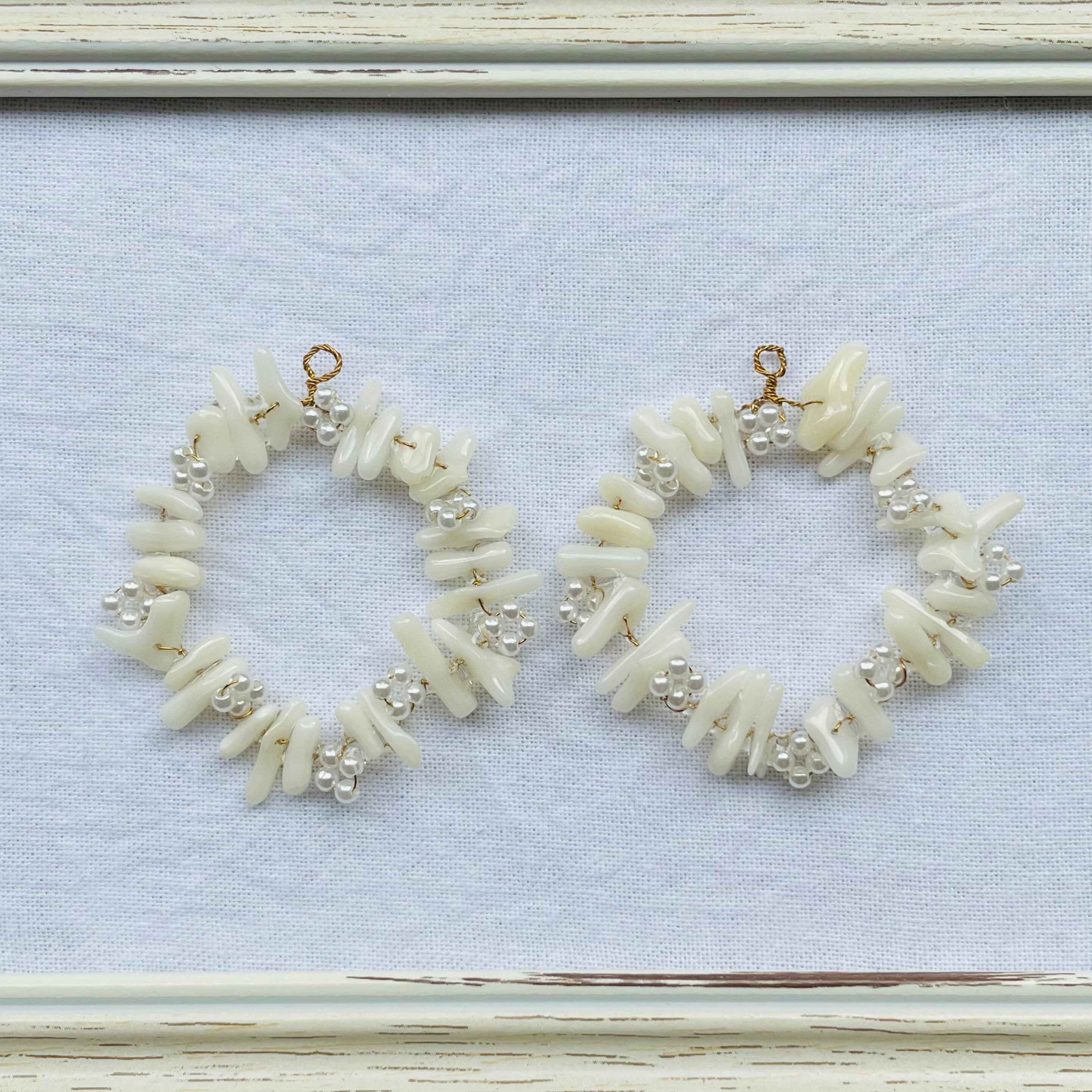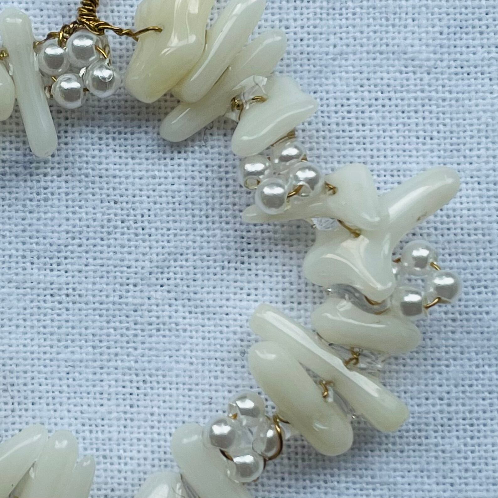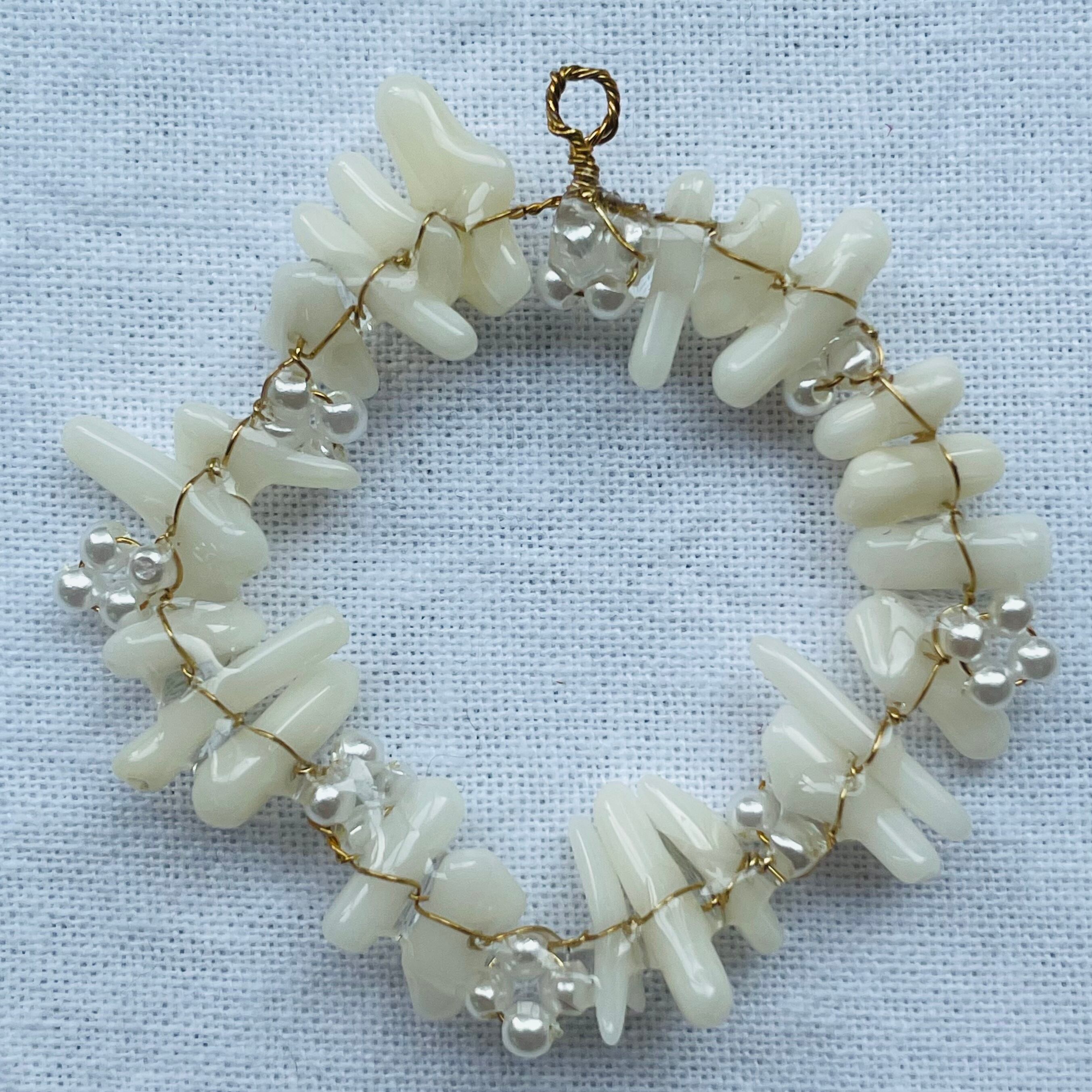 天然の小さな白い珊瑚を真鍮のワイヤーとガラスビーズで花を編みながらつなげました。