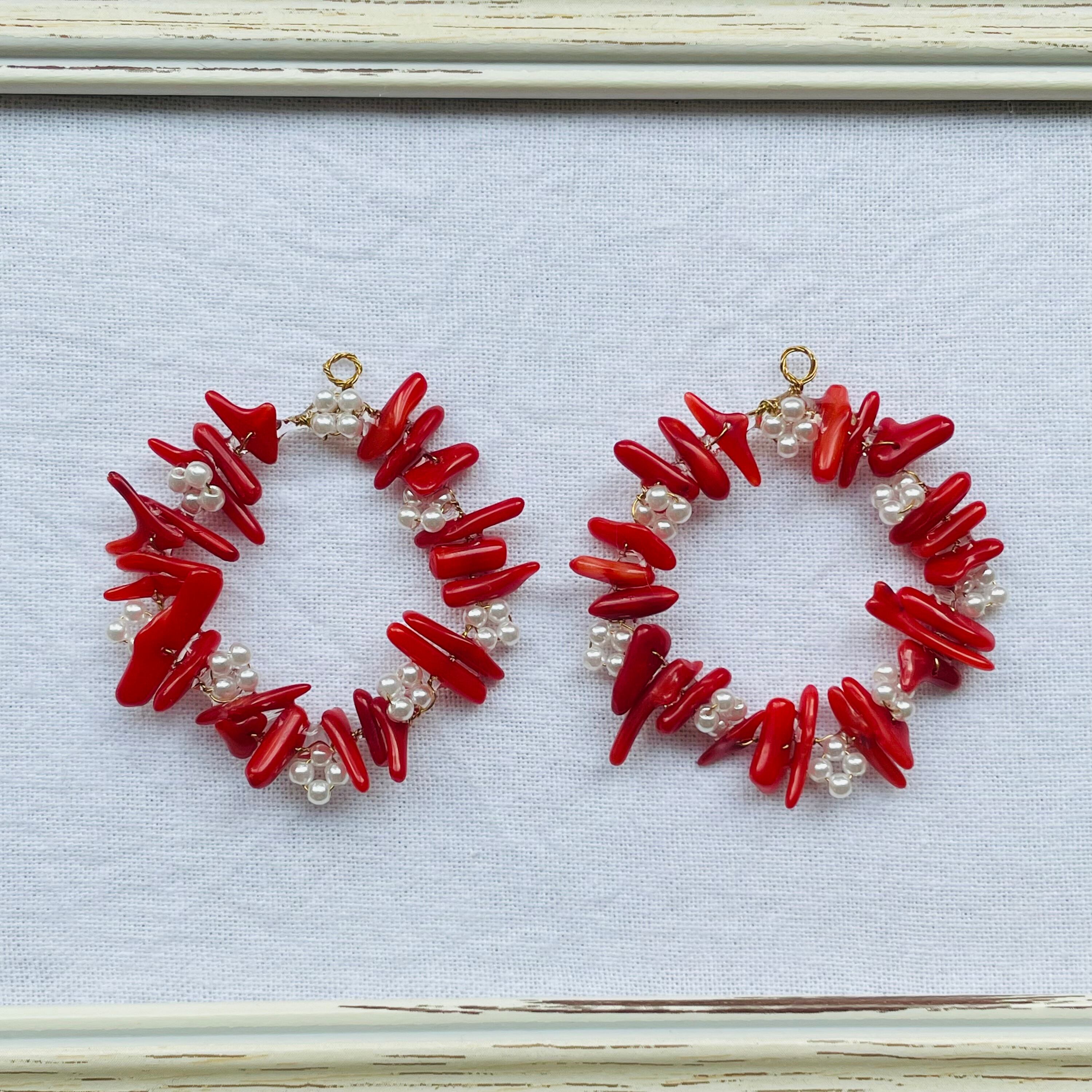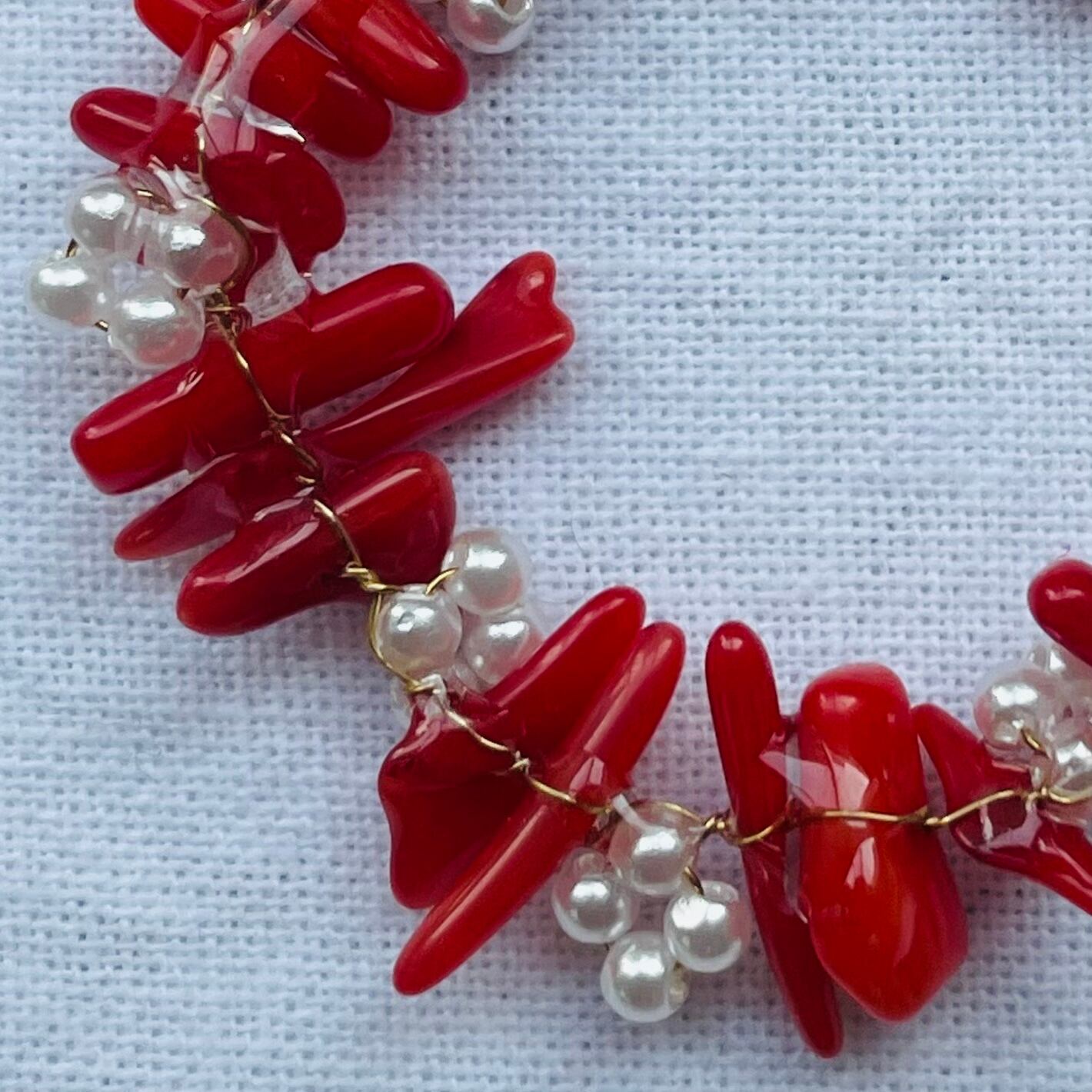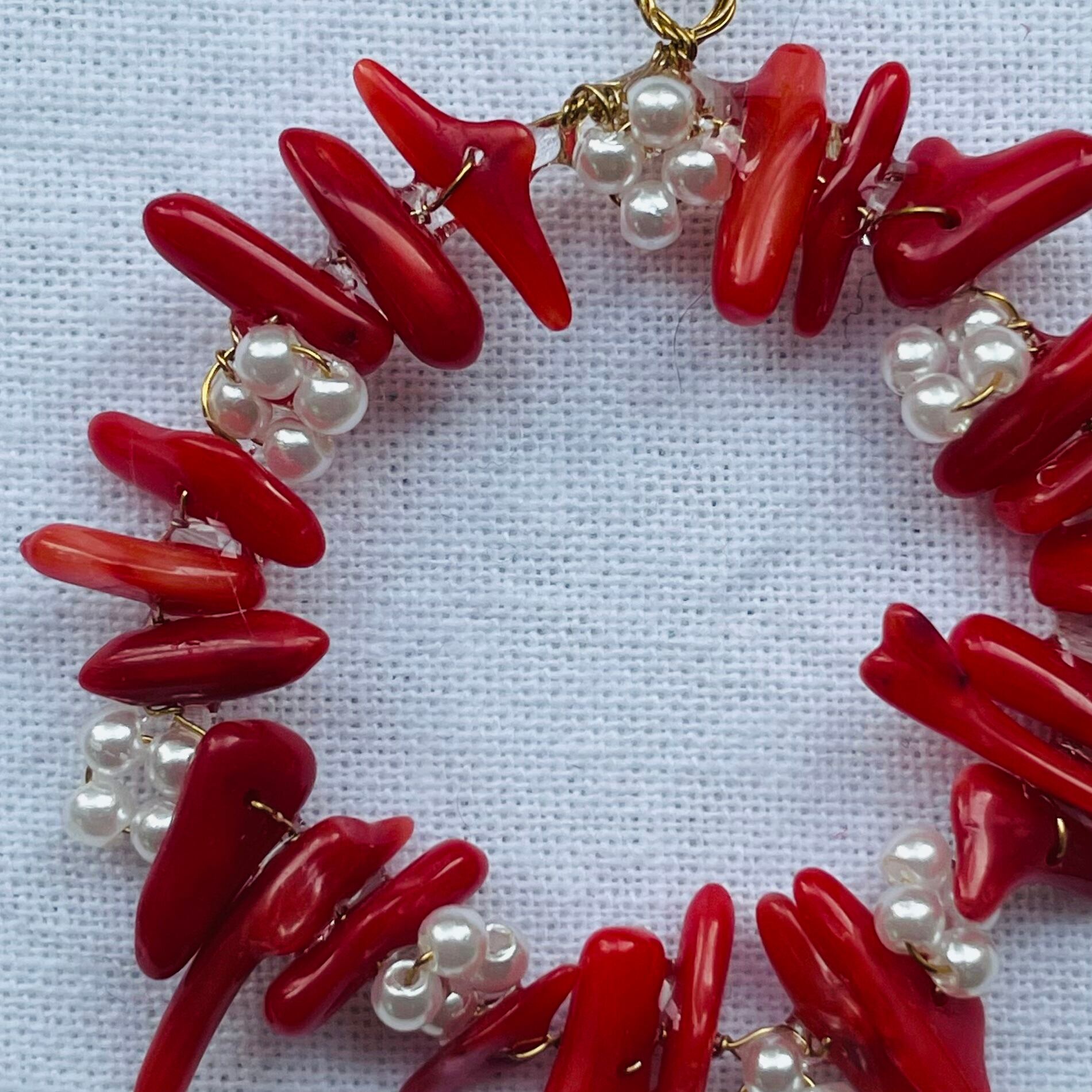 天然の小さな赤い珊瑚を真鍮のワイヤーとガラスビーズで花を編みながらつなげました。