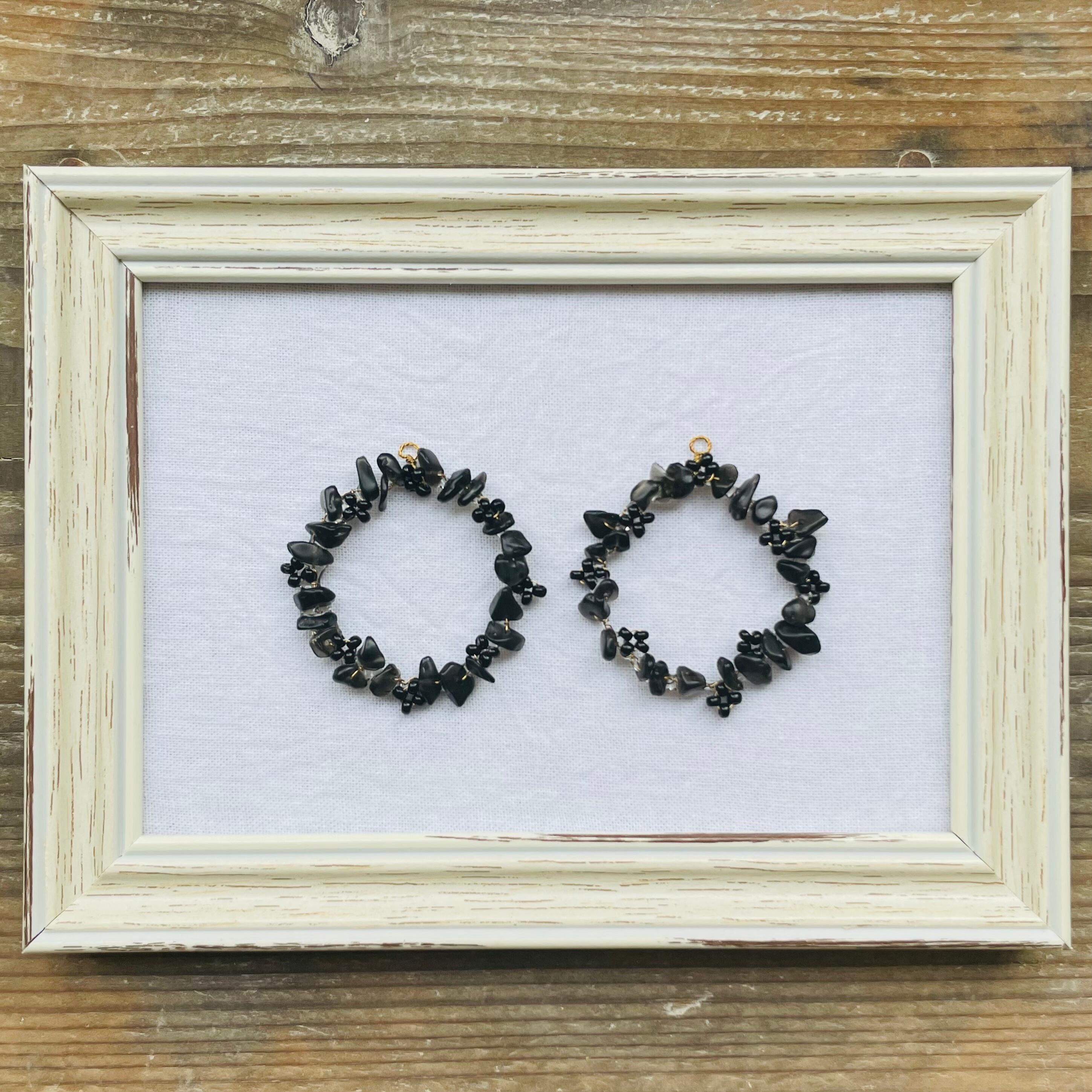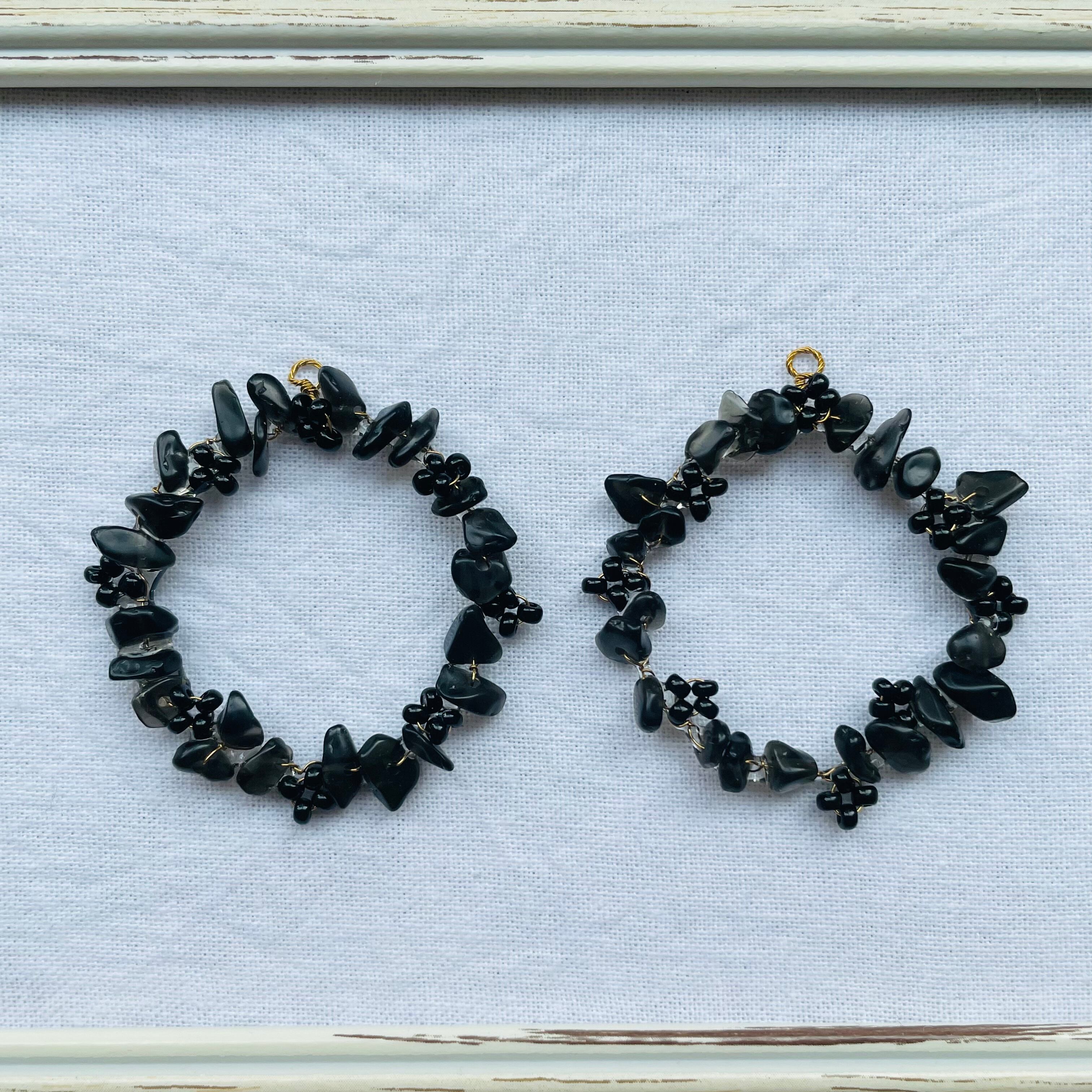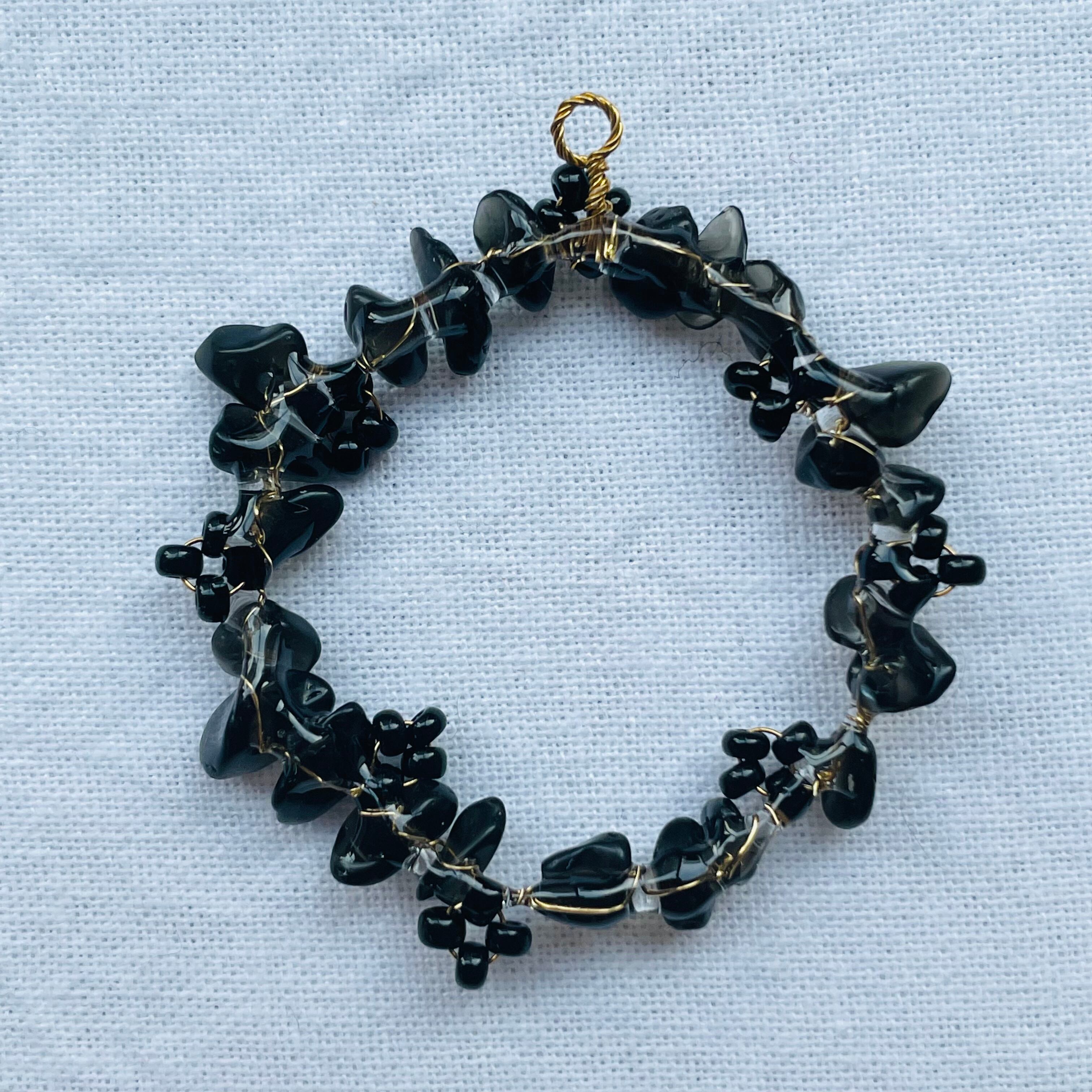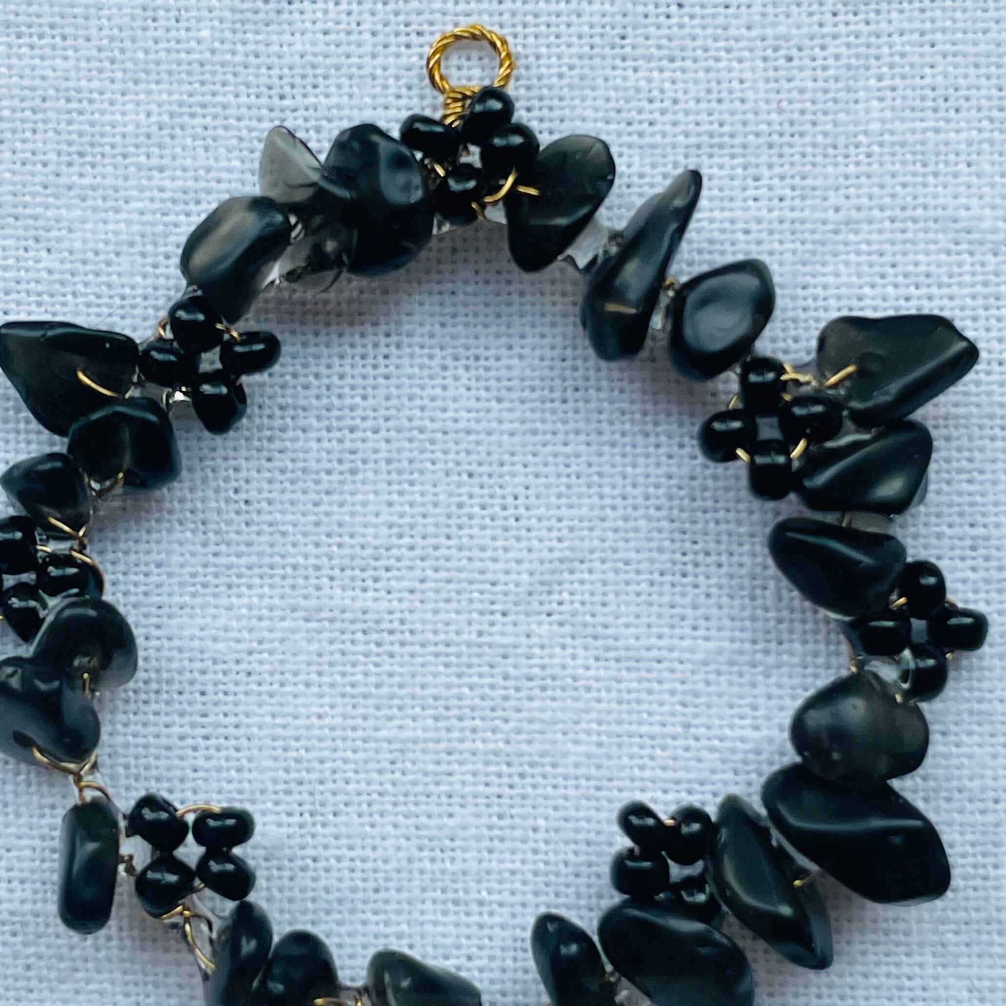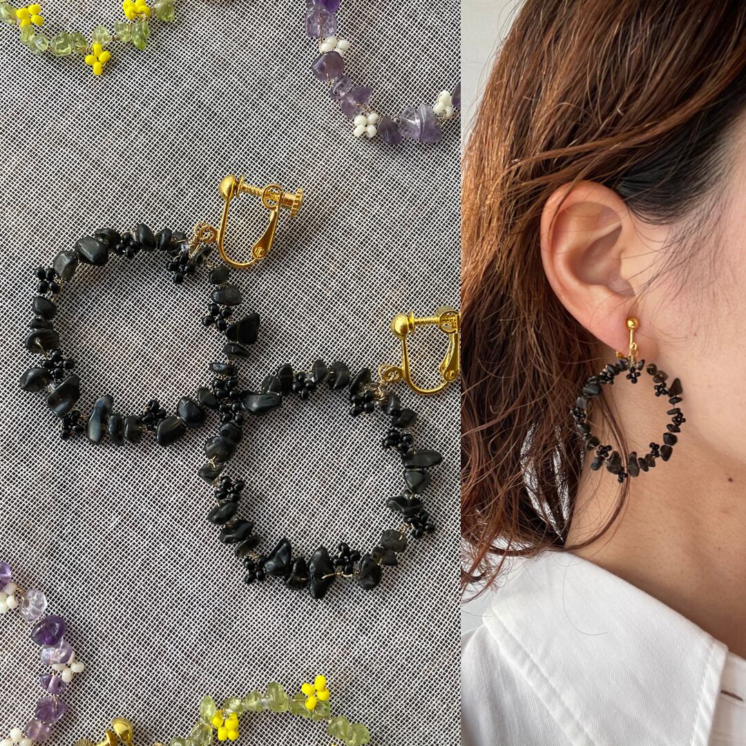 天然石のブラックオニキスを真鍮のワイヤーとガラスビーズで花を編みながらつなげました。