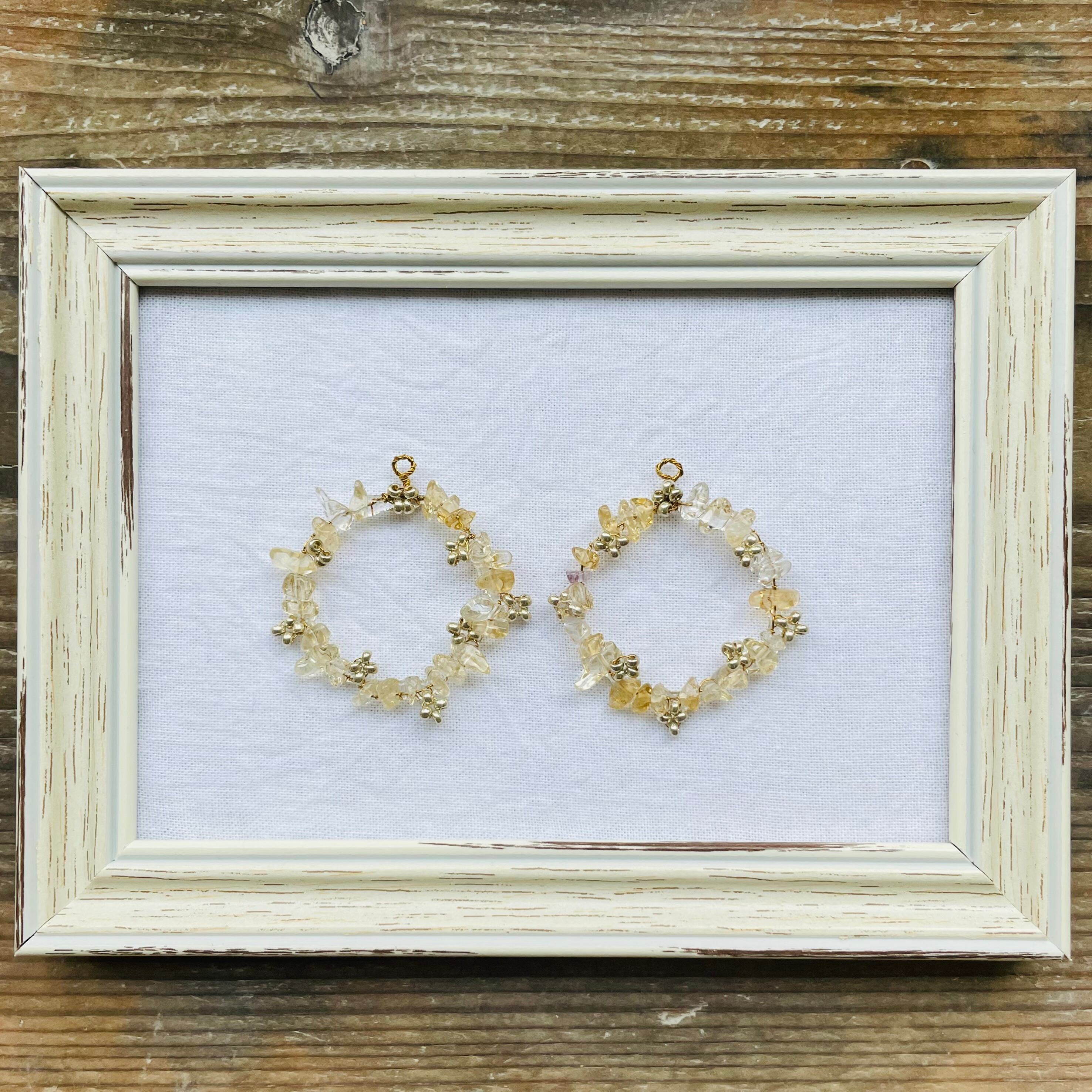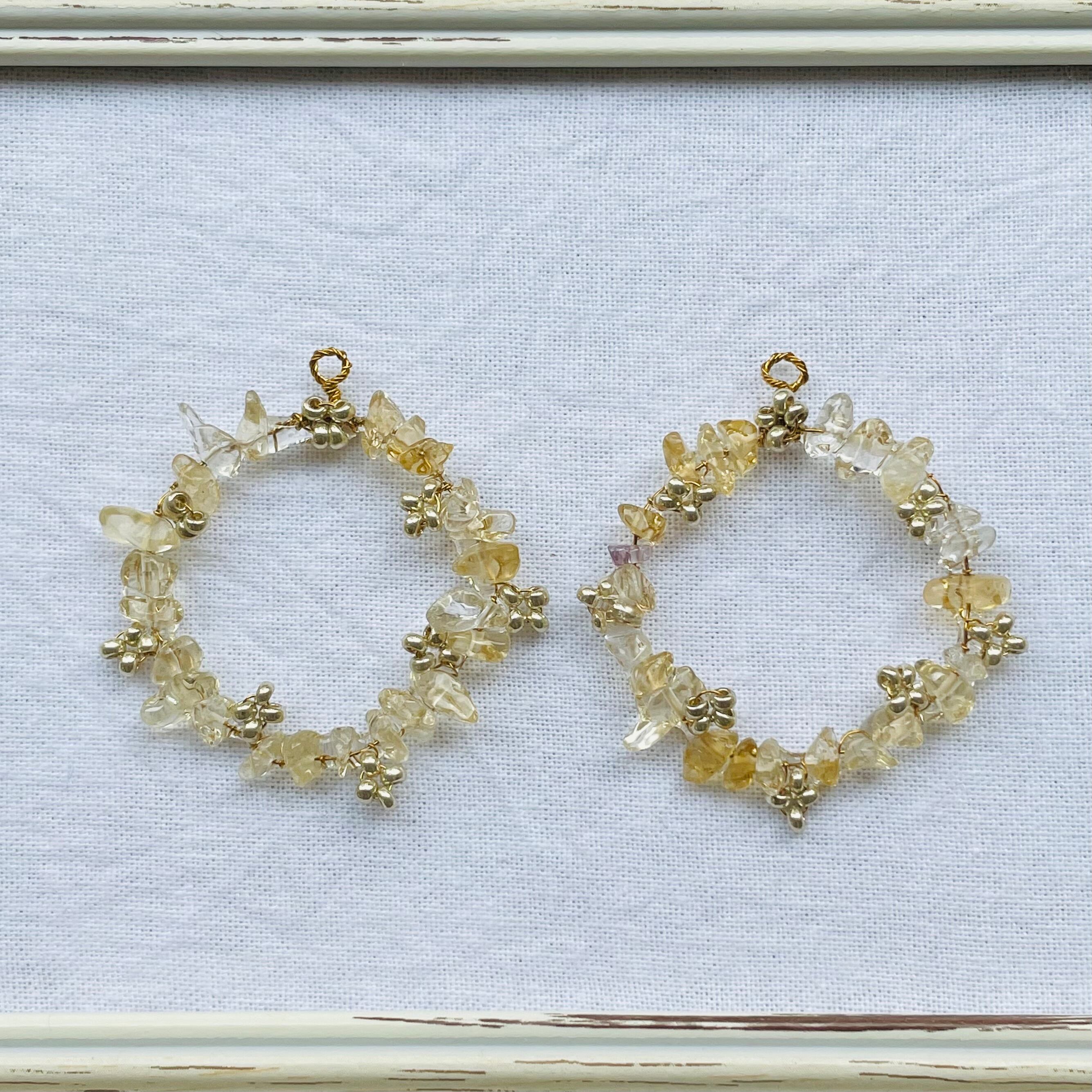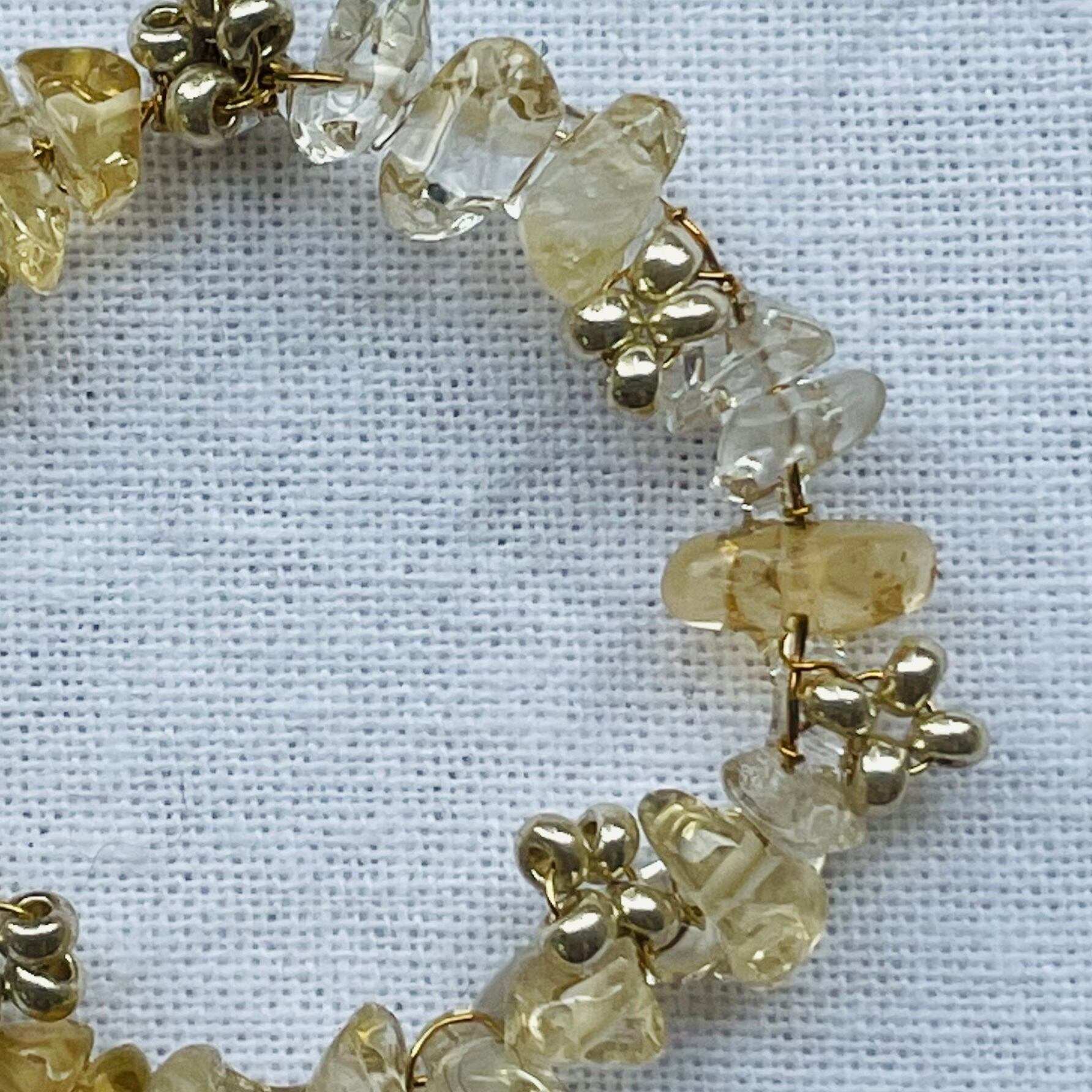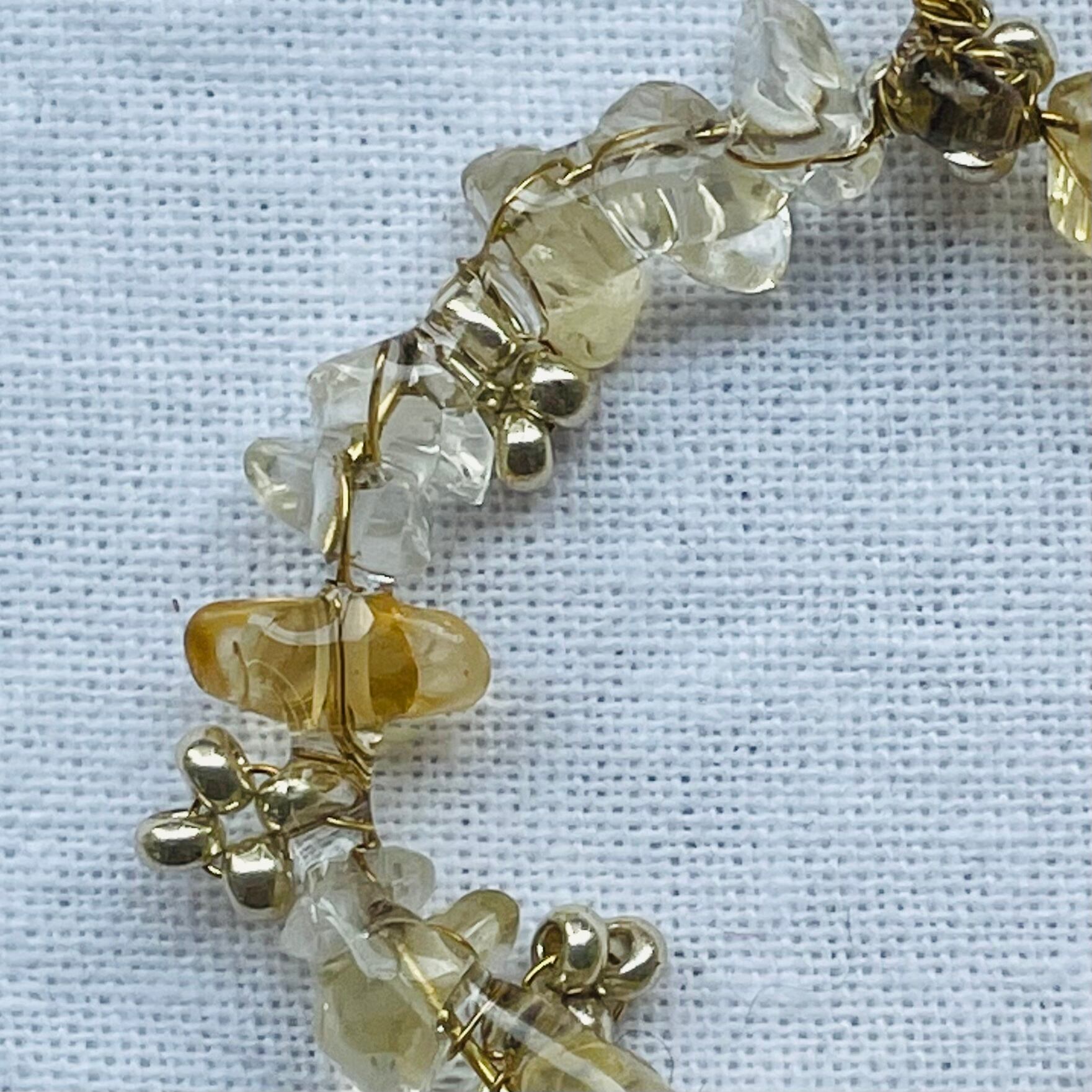 天然石の黄水晶(シトリン)を真鍮のワイヤーとガラスビーズで花を編みながらつなげました。