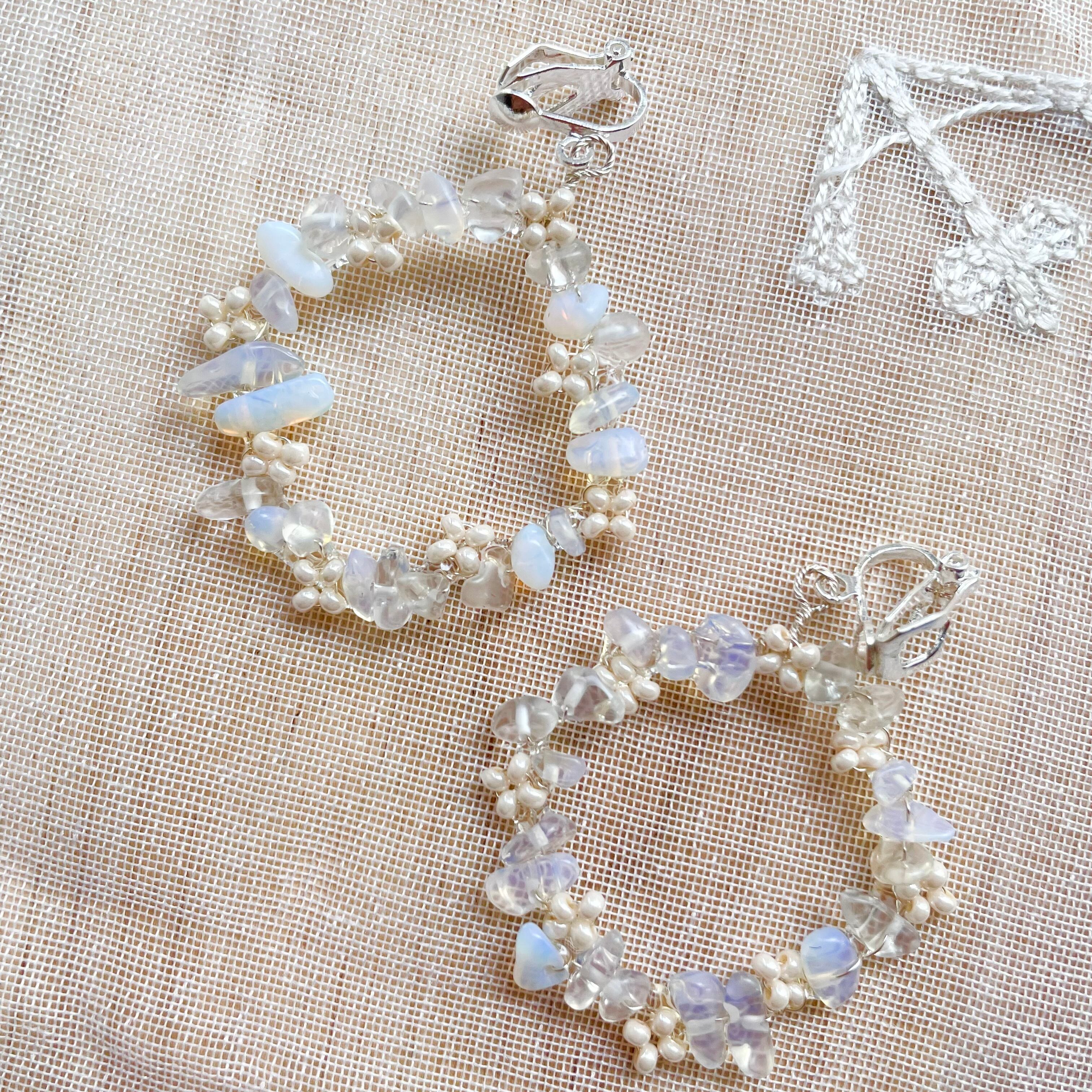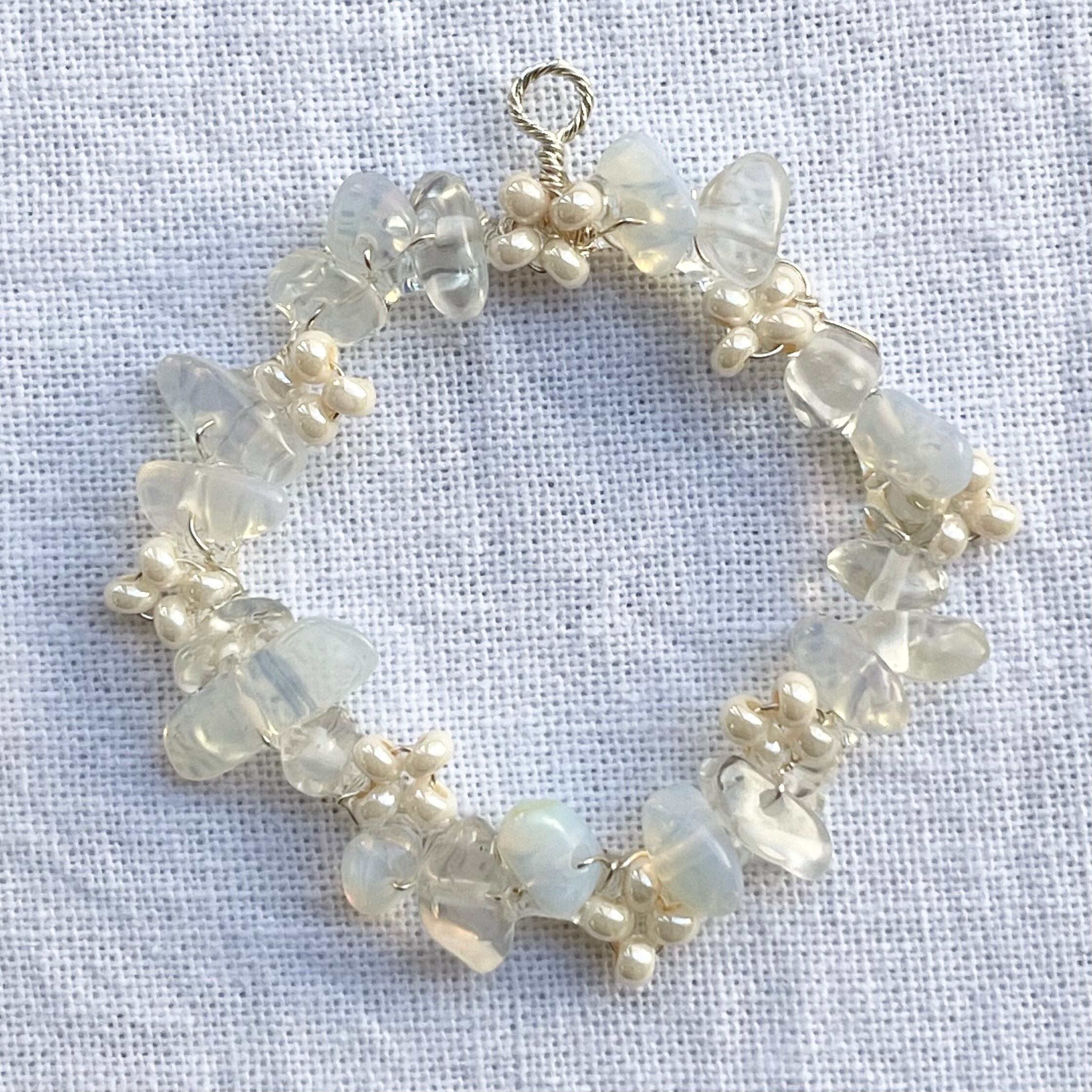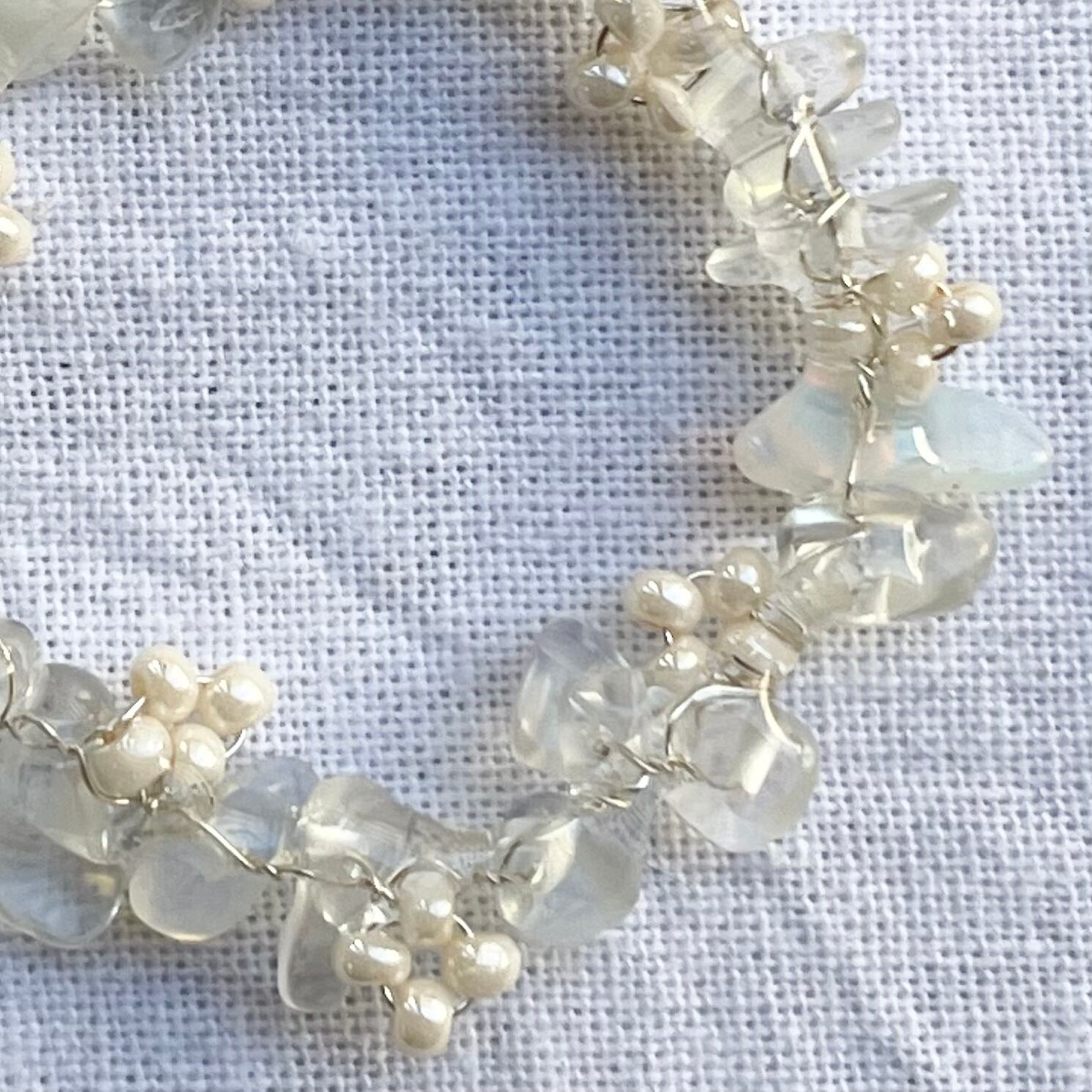 天然石のホワイトオパールを真鍮のワイヤーとガラスビーズで花を編みながらつなげました。