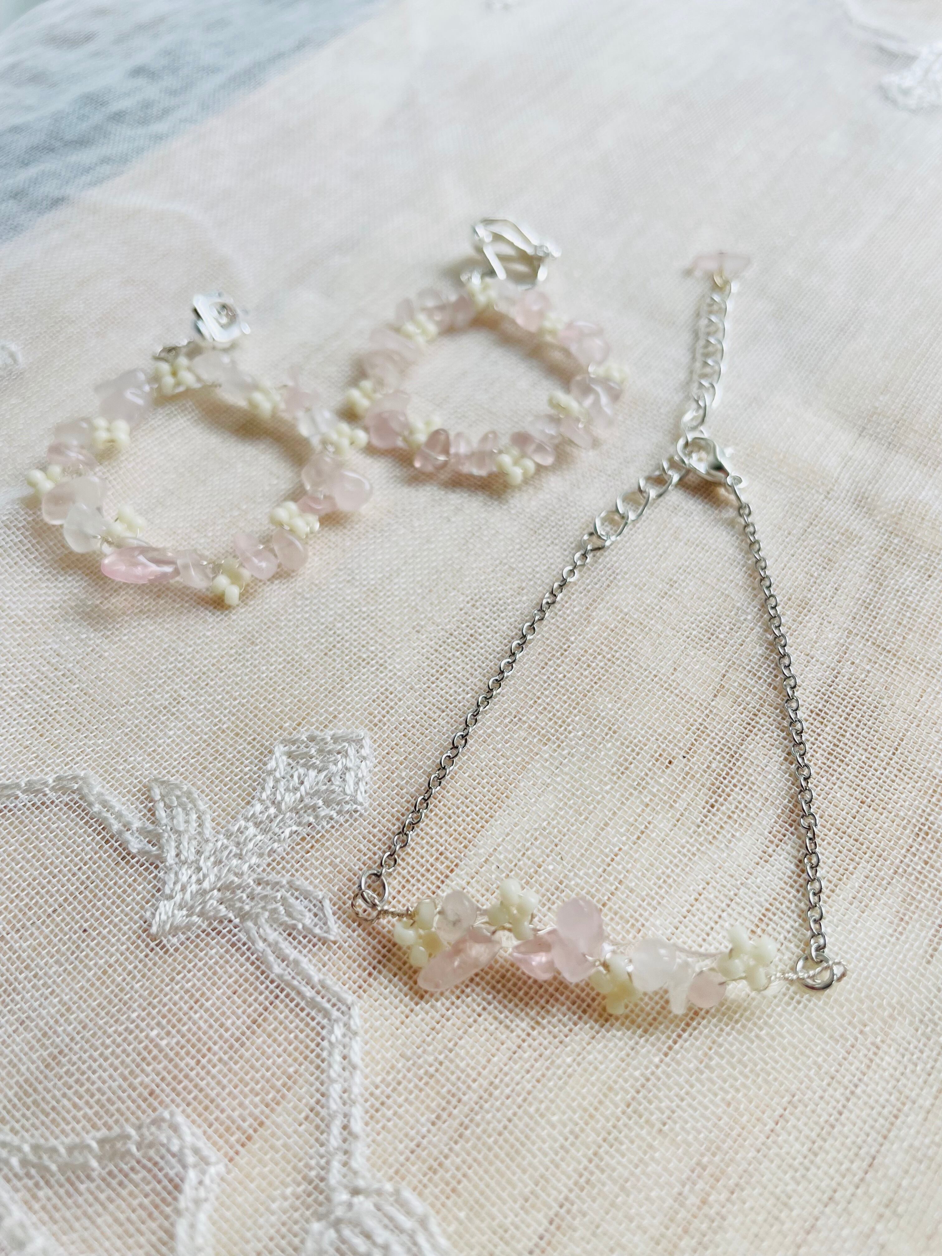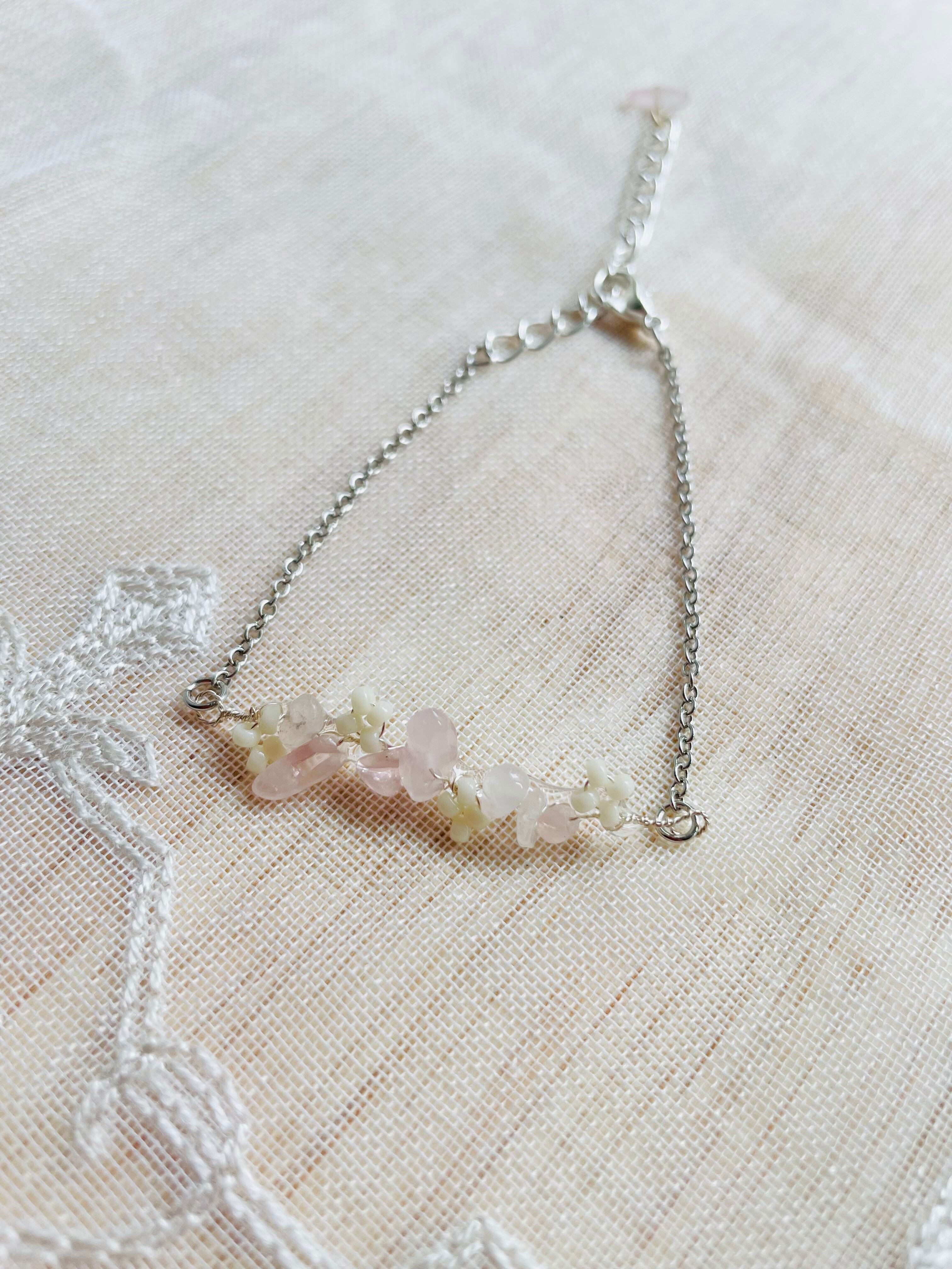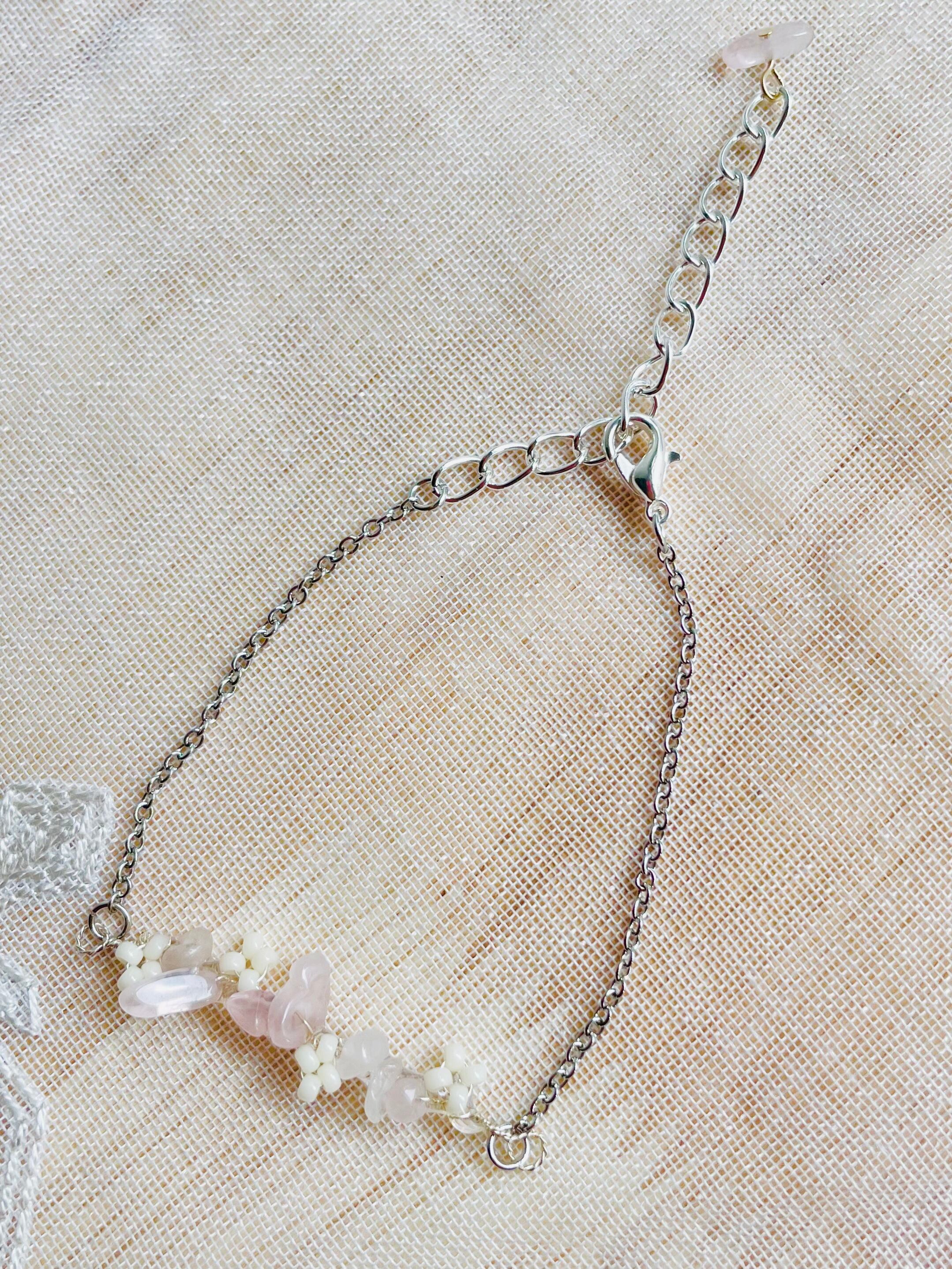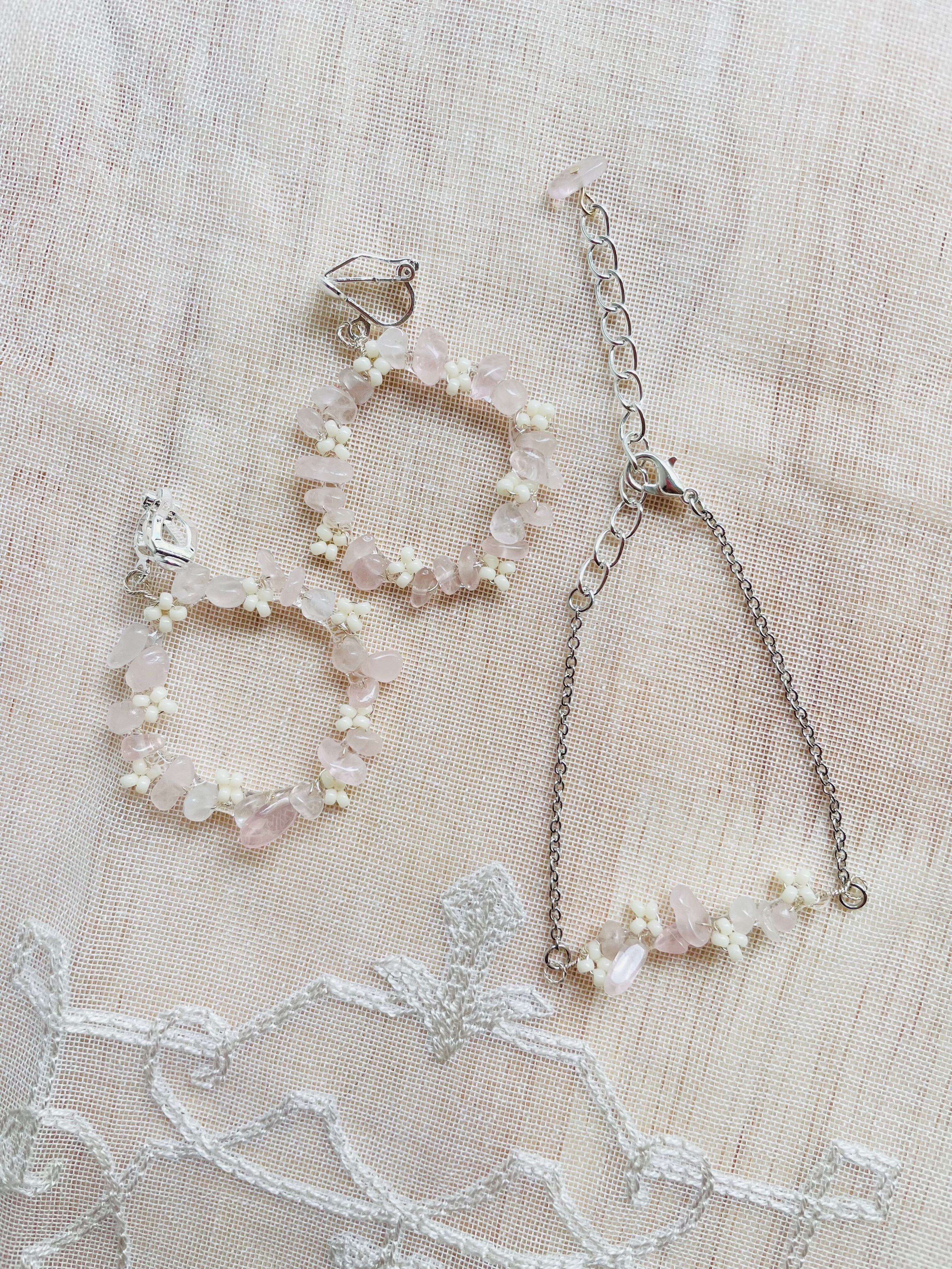 天然石の紅水晶(ローズクォーツ)を真鍮ワイヤーで花のモチーフを編みながらつなげました。